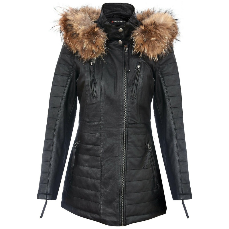 Women’s Black Leather Parka Jacket Quilted Detachable Hooded Trench Coat