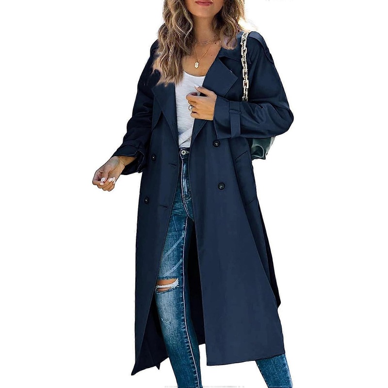 Women’s Autumn and Winter Plain Lapel Trench Coat Jacket Long Sleeve Casual Elegant Pockets Double Breasted Coat L navy blue